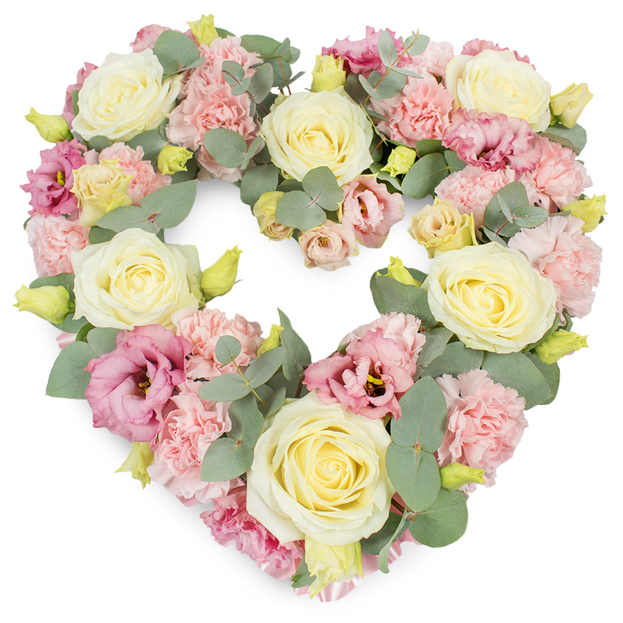 Honor your loved one with our Serene Tribute Floral Arrangement, thoughtfully designed to reflect peace and beauty. This arrangement features a harmonious mix of white roses, pink carnations, and pink lisianthus, enhanced by soothing eucalyptus leaves.